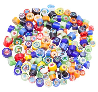 Millefiori-Mix, bunt, Größe: 7 - 10 mm Ø, Material: Glas, frostbeständig, Inhalt: 75 g = ca. 130 Stück, handgebrochen, daher variiert die Stärke der Steine.