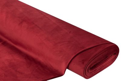Möbel-Samt "Luxor", Farbe: weinrot, mit samtiger Oberfläche und schwarz gewirkter Rückseite (leicht querelastisch), Scheuerwert: > 50.000 Touren, Lichtechtheit: 4, Breite 140 cm, Gewicht: ca. 320 g/m². Material: 100 % Polyester.