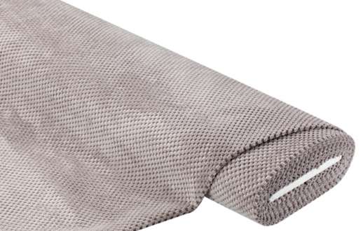 Möbelstoff Waffelvelours, Farbe: taupe, Punktegröße: 7 mm Ø, Rückseite kaschiert (mit weißem Gewebe), Scheuerbeständigkeit: > 50.000 Touren, Lichtechtheit: 4 - 5, Breite: 140 cm, Gewicht: ca. 310 g/m². Material: 90 % Polyester, 10 % Polyamid.