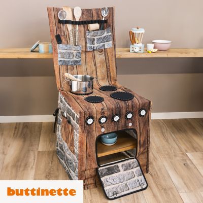Nähanleitung "Stuhlhusse Kinderküche", exklusiv von buttinette, eine Anleitung für eine Stuhlhusse als Kinderküche inkl. Schnittmuster, Größe und Material je nach Stuhl, Schwierigkeitsstufe 2/3, Stoffempfehlung: Webware, Baumwollstoffe.