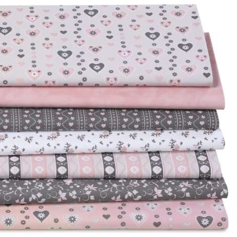 Exklusiv von buttinette: Patchwork- und Quiltpaket "Trachten", Farbe: grau/rosa, aus der Quiltserie "Mona", aus besonders feiner, weicher und hochveredelter Baumwolle (Renforcé), Gewicht: ca. 130 g/m². Paketinhalt: 7 verschiedene Muster, wie abgebildet, jeweils 30 cm lang und 75 cm breit. Material: 100 % Baumwolle.