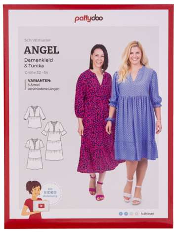 Pattydoo Schnitt "Kleid & Tunika Angel" für Damen, 3 Ärmelvarianten möglich, mehrere Saumlängen möglich, Größe 32–54, Schwierigkeitsstufe: leicht, Stoffempfehlung: leichte Blusen- und Kleiderstoffe wie Viskose-Webware, Javanaise, Musselin.