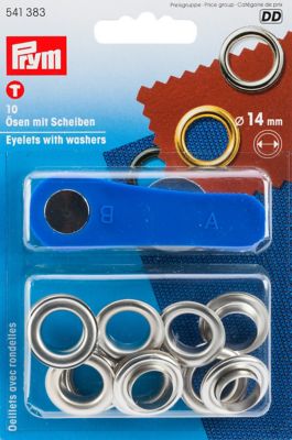 Prym Nähfrei-Ösen mit Scheiben, Farbe: silber, Größe: 14 mm Ø (innen), Material: Messing, Inhalt: 10 Stück mit Scheiben, inkl. Verarbeitungswerkzeug aus Kunststoff und Metall und Arbeitsanleitung.