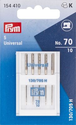 Prym Nähmaschinennadeln "Universal" in Flachkolben-Ausführung, ideal für leichte Gewebe, Stärke: 70, Inhalt: 5 Stück. Material: Stahl.