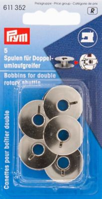 Prym Nähmaschinenspulen für Doppel-Umlaufgreifer, geeignet für Pfaff-, Meistermaschinen und andere mit dieser typischen Kapselform, aus Metall. Größe: Ø 21,9 mm, Höhe: 9 mm. Inhalt: 5 Stück.