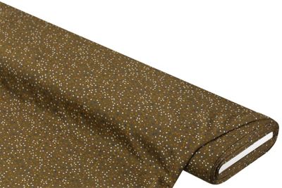 Romanit-Jersey "Tüpfchen", Farbe: khaki-color, querelastisch, Motivgröße Tüpfchen: 3 mm Ø, Breite: 150 cm, Gewicht: ca. 210 g/m². Material: 55 % Polyester, 45 % Viskose.