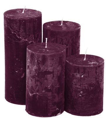 Rustikale Kerzen, abgestuft, Farbe: weinrot, Größen: 8 cm, 10 cm, 12 cm und 14 cm hoch, 6 cm Ø, Inhalt: 4 Stück.