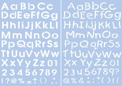 Schablonen "Alphabet" aus Kunststoff, Farbe: transparent, Größe: 21 x 29,7 cm, Motivgröße: 0,4–3,5 cm, Inhalt: 1 Schablone mit Druckschrift und 1 Schablone mit Schreibschrift = 2 Schablonen.