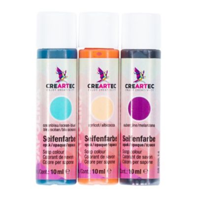 Seifenfarben-Set, Inhalt: 3x 10 ml. Zum Einfärben der geschmolzenen Seifenmasse. Für transparente und weiße Flüssigseife zu verwenden. Farben: aubergine, apricot und ozeanblau.