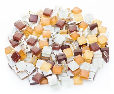 Softglas-Mosaik, frost- und hitzebeständig, Farbe: d´braun, h´braun, beige, transparent, Größe: 10 x 10 mm, Stärke: 3 mm, Inhalt: 200 g = ca. 210 Stück. Ausreichend für eine Fläche von ca. 16 x 16 cm.