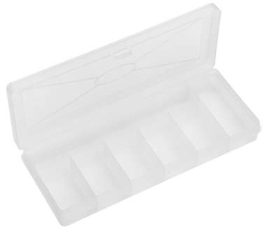Hochwertige Sortierbox aus Kunststoff, Größe: 25 x 10 x 3,5 cm. Inneneinteilung: 5 Fächer á 4 x 6 cm, 1 Fach 3,7 x 9,2 cm und 1 Fach 3 x 20,2 cm.