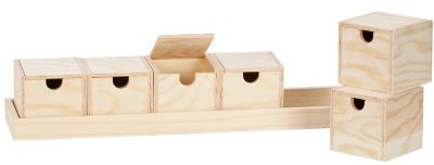 Sortierboxen mit Tablett aus Holz, Farbe: natur, Größe Tablett: 50,8 x 10 cm, Größe Box: 8 x 8 x 7,5 cm, Inhalt: 1 Tablett und 6 Boxen.