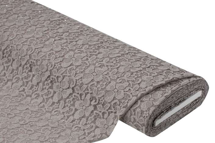 Spitzenstoff "Blumen" mit Glitzerfaden, Farbe: grau, Breite: 145 cm, Gewicht: ca. 130 g/m². Material: 100 % Polyester.