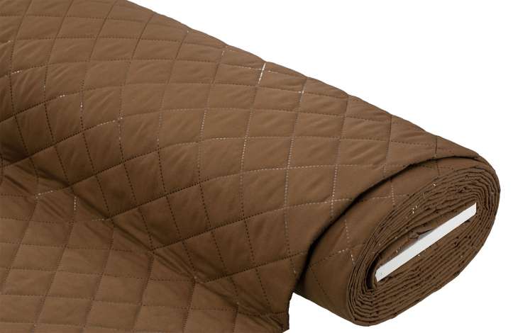 Steppstoff "Peach Skin", Farbe: dunkelbraun, nicht wasserabweisend, wattiert, Vorder- und Rückseite identisch, Rautengröße: 5 x 5 cm, Breite: 130 cm, Gewicht: ca. 250 g/m². Material: 100 % Polyester.