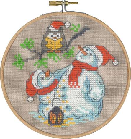 Stickbild "Eule & Schneemann", zum Besticken in Kreuzstich nach Zählvorlage (ca. 10 Fäden/cm). Komplettpackung: Anleitung, Zählvorlage, Garn, Sticknadel, Stickring Ø 13 cm. Stofffarbe: leinen. Größe: Ø 13 cm. Material: Stoff 100 % Leinen, Garn 100 % Baumwolle.