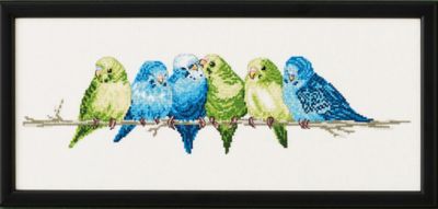 Stickbild "Wellensittiche", zum Besticken in Kreuzstich nach Zählvorlage (ca. 6,4 Stiche/cm). Komplettpackung: Anleitung, Garn, Sticknadel. Ohne Rahmen. Stofffarbe: altweiß. Größe: 36 x 15 cm. Material: Stoff und Garn 100 % Baumwolle.