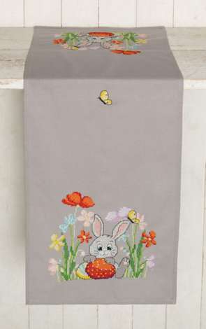 Stickläufer "Happy Easter", zum Besticken in Kreuzstich. Vorgedrucktes Motiv, randfertig gesäumt. Komplettpackung: Anleitung, Garn, Sticknadel. Stofffarbe: grau. Größe: 35 x 95 cm. Material: Stoff und Garn 100 % Baumwolle.