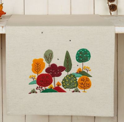 Stickläufer "Herbstwald", zum Besticken in Stiel-, Spann-, Knötchen,- Plattstich und Nadelmalerei. Vorgedrucktes Motiv, randfertig gesäumt. Komplettpackung: Anleitung, Garn, Sticknadel. Stofffarbe: leinen. Größe: 35 x 95 cm. Material: Stoff 50 % Baumwolle, 50 % Leinen, Garn 100 % Baumwolle.