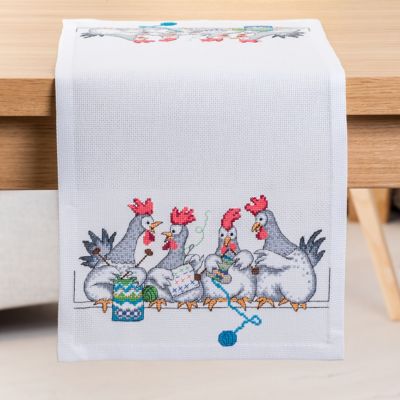 Stickläufer "Hühnergespräch", zum Besticken nach Zählvorlage in Kreuzstich (ca. 5,4 Stiche/cm), ungesäumt. Komplettpackung: Anleitung, Garn, Sticknadel. Stofffarbe: weiß. Größe: 30 x 75 cm, gesäumt 27 x 65 cm. Material: Aida-Stoff und Garn 100 % Baumwolle.