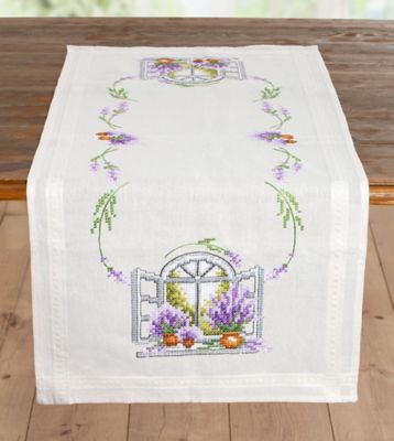Stickläufer "Lavendel-Fenster", zum Besticken in Kreuz- und Stielstich. Vorgedrucktes Motiv, mit Webrand, randfertig gesäumt. Komplettpackung: Anleitung, Garn, Sticknadel. Stofffarbe: ecru. Größe: 40 x 100 cm. Material: 100 % Baumwolle.