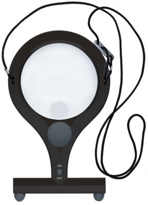 Sticklupe mit Beleuchtung aus Kunststoff, Linse für 2-fache Vergrößerung, integrierte Zusatzlinse für 4-fache Vergrößerung. Größe: 10 cm Ø, Zusatzlinse für 4-fache Vergrößerung Größe: 2,5 cm Ø. Mit 2 LEDs mit 2,5 Volt und Band zum Umhängen. Farbe: schwarz. Größe Gerät gesamt: ca. 13,5 x 22 cm. Farbtemperatur: 700 - 8500 K (tageslichtweiß). Batteriebetrieb 2 x 1,5 V AA. Lieferung ohne Batterien.