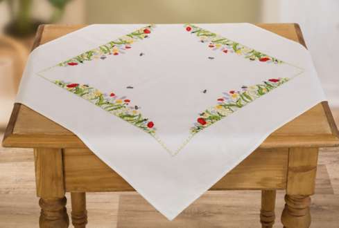 Stickmitteldecke "Alpenwiese", zum Besticken in Stiel-, Platt-, Knötchen-, Margeriten-, Spann-, Kettenstich und Nadelmalerei. Vorgedrucktes Motiv, randfertig gesäumt. Komplettpackung: Anleitung, Garn, Sticknadel. Stofffarbe: weiß. Größe: 77 x 77 cm. Materal: Stoff und Garn 100 % Baumwolle.