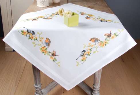 Stickmitteldecke "Heimische Singvögel", zum Besticken in Kreuz- und Stielstich. Vorgedrucktes Motiv, mit Webrand, randfertig gesäumt. Komplettpackung: Anleitung, Garn, Sticknadel. Stofffarbe: weiß. Größe: 80 x 80 cm. Material: Stoff und Garn 100 % Baumwolle.