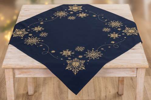 Stickmitteldecke "Kristallzauber", zum Besticken in Spann-, Stiel-, Margeriten-, Knötchen- und Plattstich. Vorgedrucktes Motiv, randfertig gesäumt. Komplettpackung: Anleitung, Garn, Sticknadel. Stofffarbe: dunkelblau. Größe: 72 x 72 cm. Material: Stoff 100 % Baumwolle, Garn 100 % Polyester.