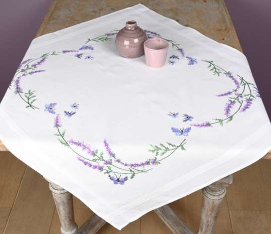 Stickmitteldecke "Lavendel-Zeit", zum Besticken in Kreuz-, Spann- und Stielstich. Vorgedrucktes Motiv, mit Webrand, randfertig gesäumt. Komplettpackung: Anleitung, Garn, Sticknadel. Stofffarbe: weiß. Größe: 80 x 80 cm. Material: Stoff und Garn 100 % Baumwolle.