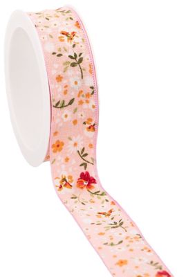 Stoffband "Blumen", Farbe: rosa, Breite: 25 mm, 5 m pro Rolle. Material: 100 % Polyester.