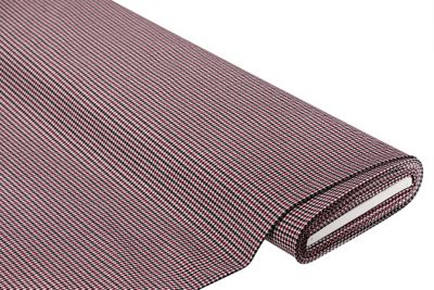 Stretch-Webstoff "Pepita", Farbe: rot/schwarz/weiß, querelastisch, Breite: 145 cm, Gewicht: ca. 240 g/m². Material: 50 % Polyester, 45 % Viskose, 5 % Elasthan.