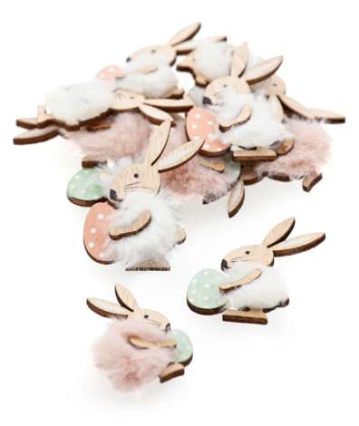 Streuteile "Häschen" aus Holz, mit Fellimitat-Besatz, Farben: braun, rosa, mint, Größe: 3 x 5 cm, Inhalt: 12 Stück.