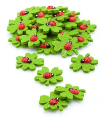 Streuteile "Kleeblätter" aus Filz, mit Holz-Marienkäfer, mit Klebepunkt auf der Rückseite, Größe: 3,5 cm, Inhalt: 24 Stück.
