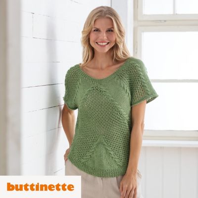 Strickanleitung – Shirt aus Woll Butt Dalida. Frühlingsfrisch wirkt dieses Strick-Shirt aus der Qualität Woll Butt Primo Dalida in hellem Grün – da freut man sich doch auf die kommenden warmen Tage! Das Shirt wird von oben nach unten gestrickt und hat kurze angeschnittene Ärmel. Highlight sind die kleinen Zöpfe, die vom Halsausschnitt diagonal nach unten verlaufen und glatt rechts gestrickte Flächen sowie Lochmuster-Flächen einschließen.