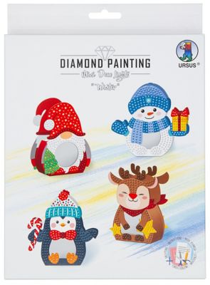 Ursus Diamantenstickerei Tischlaternen-Set "Winter", bestehend aus 4 vorgestanzten Tischlaternen, Perlenbehälter, Perlenpicker, Wachs und Perlen ausreichend für die vorgedruckten Motive mit einer kleinen Reserve zusätzlich und einer Anleitung. Größe: 8,7–13,1 x 12,3–12,6 cm.