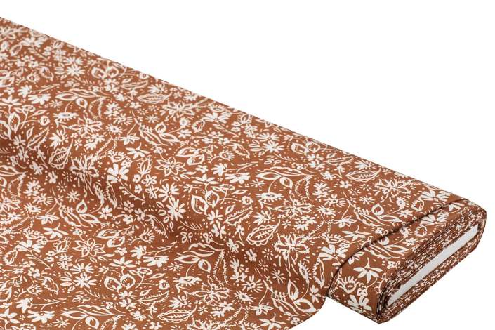Viskose-Twill "Blumen", Farbe: terrakotta/weiß, Motivgröße kleine Blume: 1 cm Ø, Breite: 140 cm, Gewicht: ca. 140 g/m². Material: 100 % Viskose.