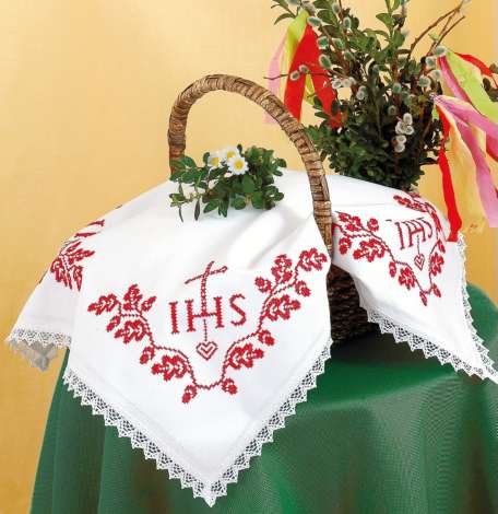 Weihkorbdecke "Eiche", mit Spitze und eingewebten Stickfeldern zum einfachen Aussticken, ohne Stickgarn. Größe: 55 x 55 cm, Stofffarbe: weiß, Material: 100 % Baumwolle. Gewicht: ca. 230 g/ m2.