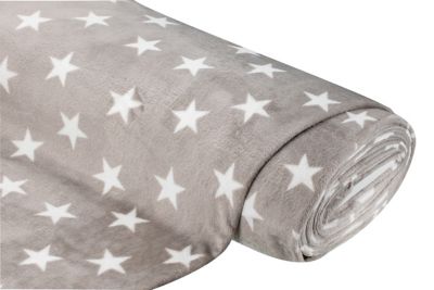 Kuscheliges Wellness-Fleece "Sterne", Farbe: hellgrau/weiß, Motivgröße Sterne: 5 cm Ø, Florhöhe: 7 mm, Breite: 150 cm, Gewicht: ca. 260 g/m². Material: 100 % Polyester.