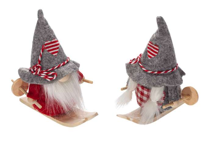 Wichtel auf Skiern aus Filz, mit Sandfüllung, Skier und Skistöcke aus Holz, Farbe: rot-grau-weiß, Größe: 9,5 x 5 x 10,5 cm, Inhalt: 2 Stück. Nur für Dekorationszwecke geeignet.