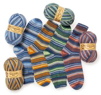 Dieses Sparpaket enthält Wolle für 4 Paar Socken in den Color-Farben: blau, grün, braun und ocker.